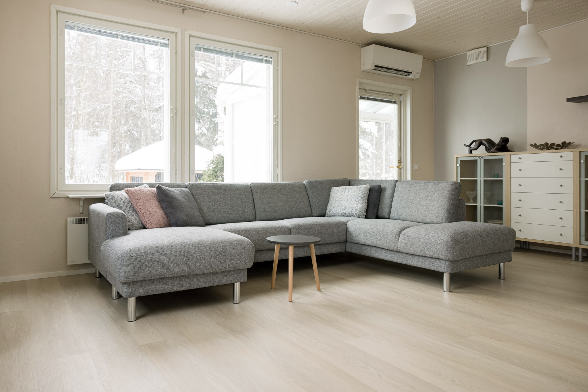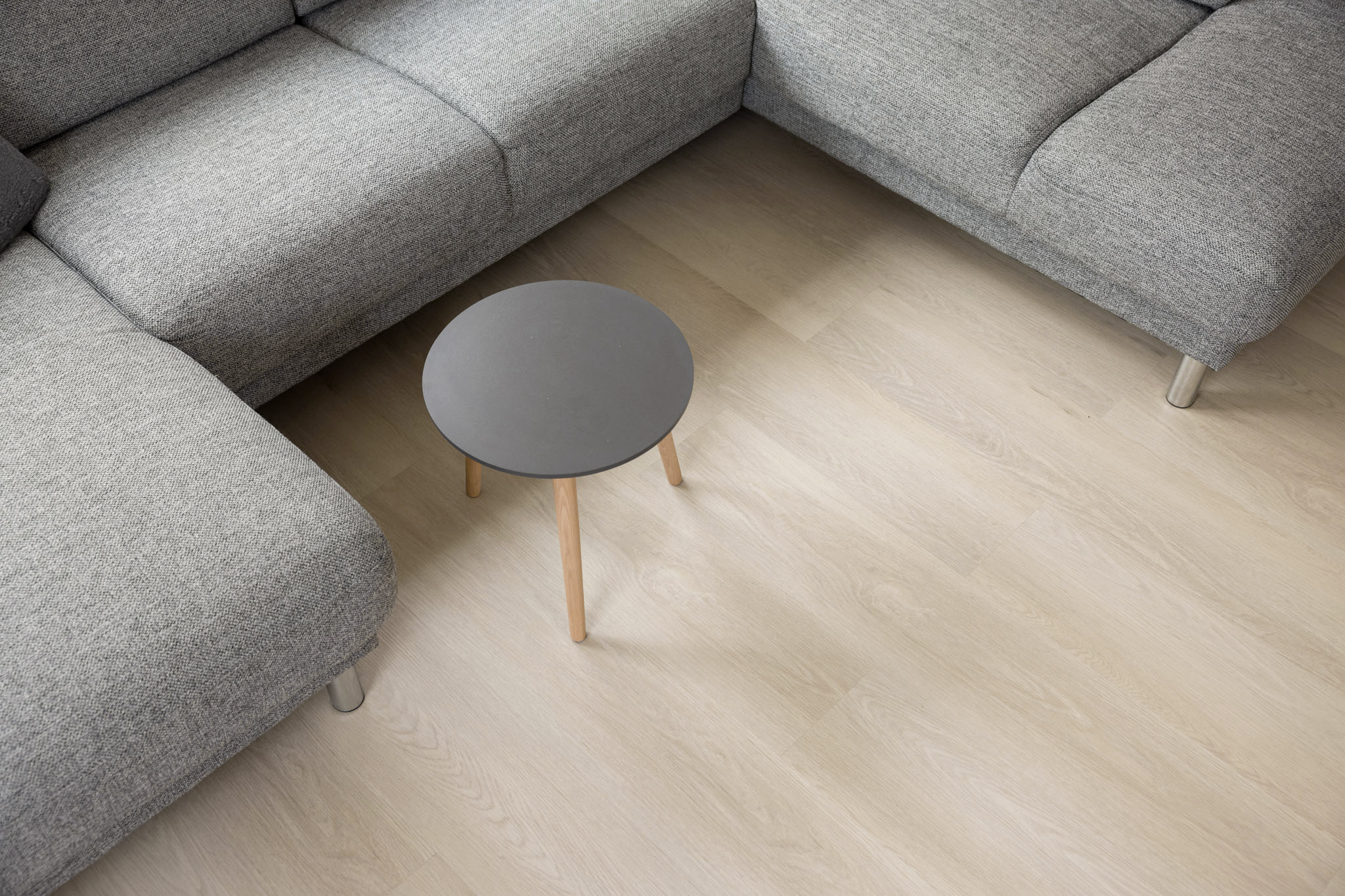 Puuteri är en fantastisk vinylplanka som påminner om ljus ekparkett. Golvets nyans drar svagt åt det varma hållet, men trots sin värme upplevs den inte som rödaktig. Ytmönstret är diskret och harmoniskt, och nyansvariationerna är små. Puuteri är en av våra mest populära nyanser och finns, förutom som plank, även som fiskbensvinyl.